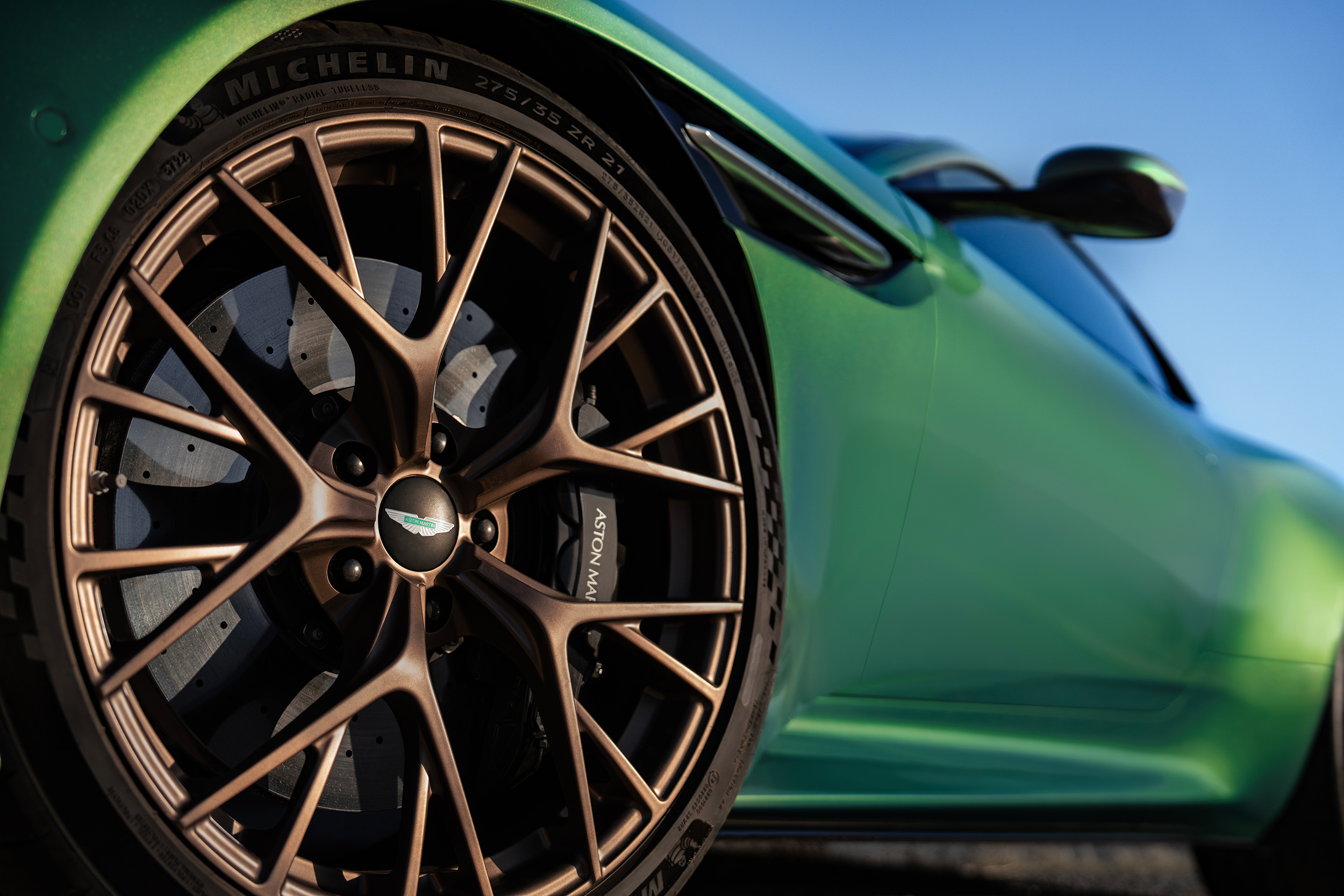 Mounted on new, larger 21-inch alloy wheels, trimmed to maximise the harmony between the tyre and tarmac. DB12 also debuts the new Michelin Pilot Sport 5S tyre. Developed alongside Michelin and bespoke to Aston Martin. A hand spun compound for unparalleled lateral grip, to dampen the effects of rain and cushion comfort into every roll of tread.