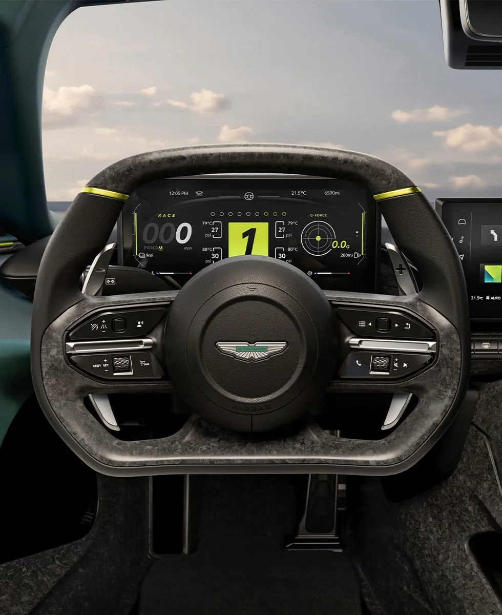 Valhalla's raised-heel driving position is inspired by Formula 1®. As are the on-screen graphics when Race mode is activated. The driver is poised low. Exhilaration peaked high. Footwells raised for a more directional, hip-to-heel seating position. Bespoke and beautifully crafted carbon fibre seats. With a suite of other Formula 1® derived hallmarks, the architecture creates a pared-back cockpit design with clear, simple ergonomics totally focused on the driver.