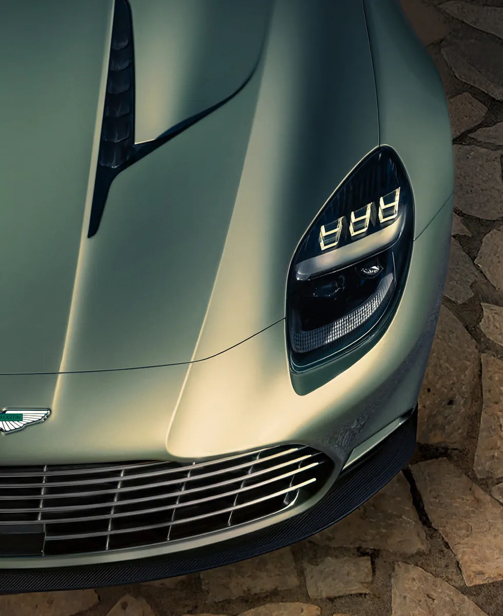 Vanquish Volante features Matrix LED headlights* with a six-block design pattern specifically created to reduce light refraction. Intricately designed and textured. Engraved with the Aston Martin name for an elegant finishing touch. Framing the shield at the rear, seven unique light blades emphasise the car's width and offer a unique light signature. Specially modified from those of Valhalla, they also provide a characterful start-up light sequence, ensuring Vanquish Volante is as instantly recognisable at night as it is during the day.